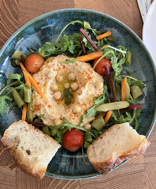 We both opted for vegetarian starters. I had hummus with roasted chickpeas, tomatoes, pickles and focaccia.