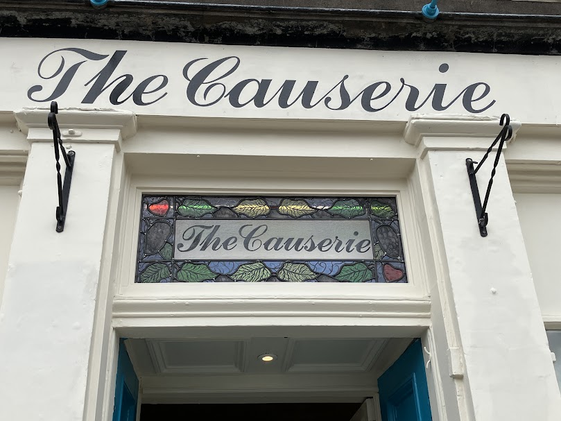 The new rollator has been out to a few places, including The Causerie, a recently opened wine bar in Blairgowrie about half a mile from our house. The premises had previously been occupied by a succession of cafes and we were keen to see what the new incarnation was like. An attractive stained glass window panel had been inserted above the front door.