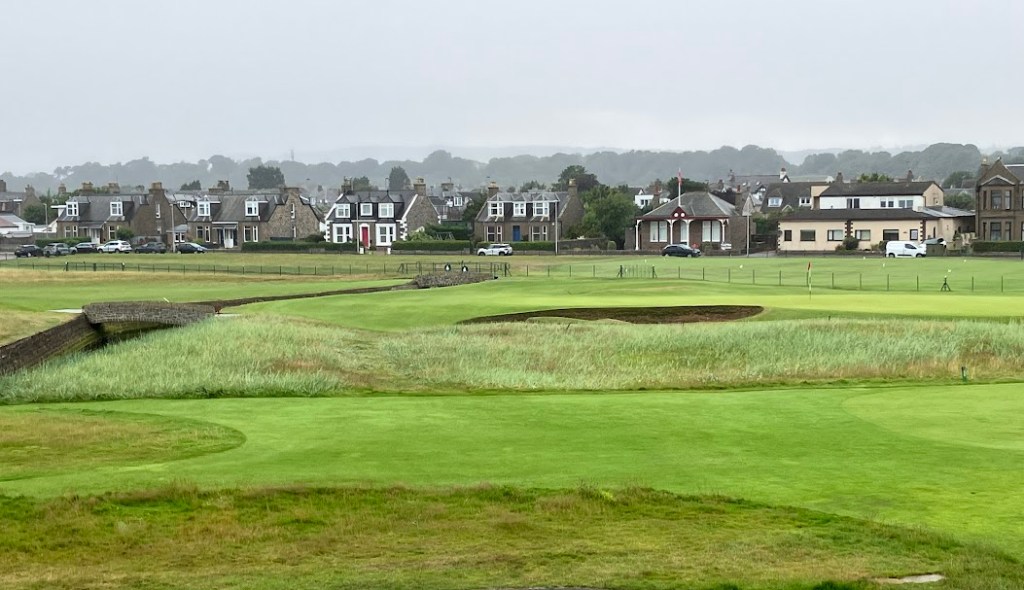 The 18th green at Carnoustie Golf Links. The railway line runs just behind the houses shown.
