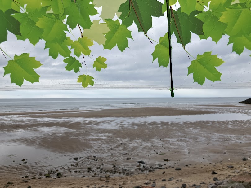 When we’d finished our meal and left the building, I got into the car for a nap while Lorna took a walk to look at the sea. She had a large umbrella with her, made from clear plastic decorated with leaves, which gives the impression of standing under a tree. She didn’t stay out for long as the rain was very heavy and soaked her trousers in a few brief minutes.