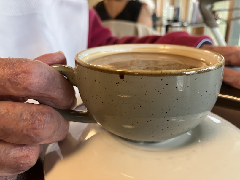 When we’d seen enough, we went back down in the lift, collected my rollator, and trudged back to the car. I found the walk back more tiring than the walk in, but I managed it, and was very glad to settle into the car. By this time we felt we had room for a hot drink and a snack, and decided to drive the short distance to the Macmillan cafe at Quarrymill, on the outskirts of Perth.