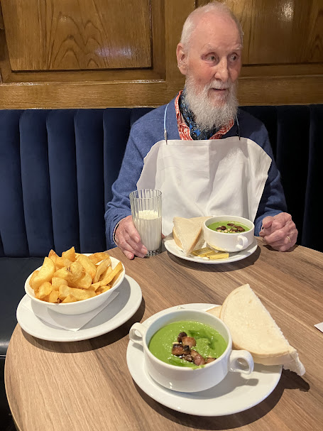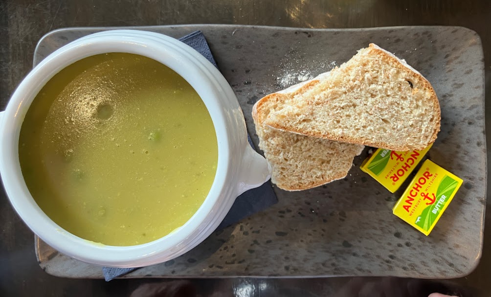 The bar serves both light meals and larger options. Flora went for fish and chips, Lorna had a vegetable curry, and I chose pea and mint soup.