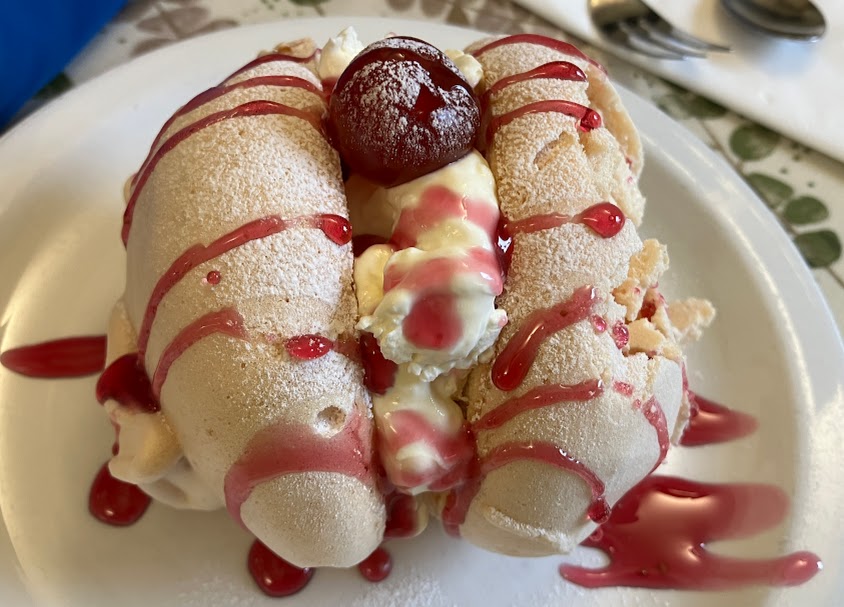 I was tempted by a meringue with fruit and cream, which proved quite challenging (but well worth the effort) to consume.