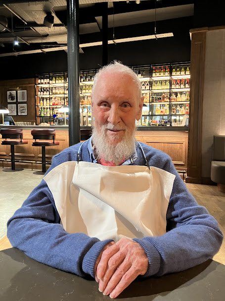 Having checked with the receptionist that lunches were indeed being served in the bar, we chose a seat, sat down and got settled for our meal. I removed my jacket, put on my bib, and waited for someone to appear.