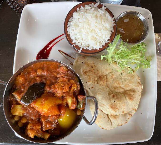 Vegetable curry with rice, naan bread and mango chutney for Lorna.