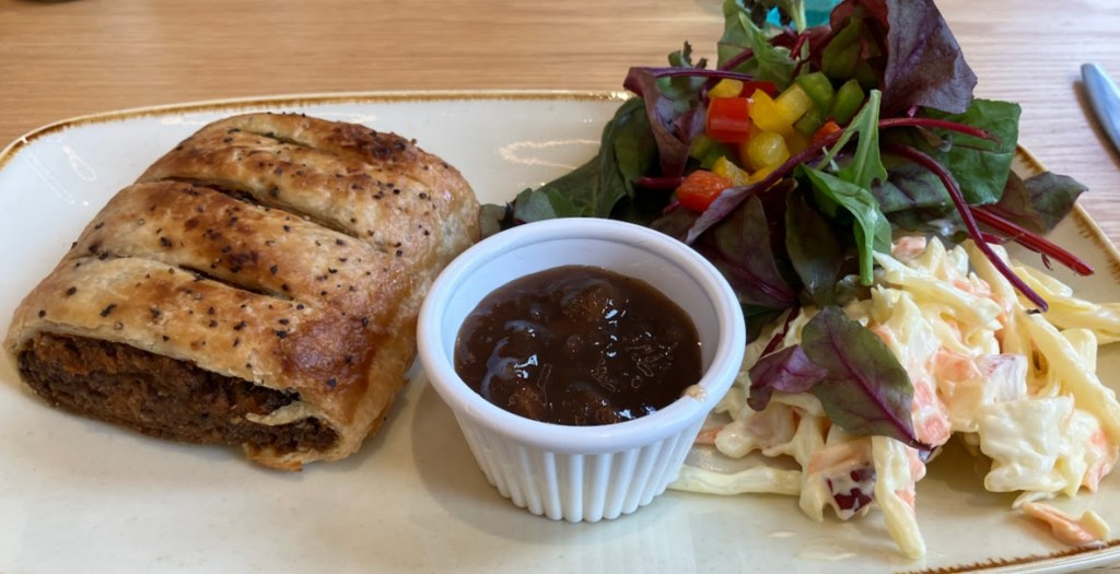Vegetarian haggis sausage roll with chutney, salad and coleslaw.