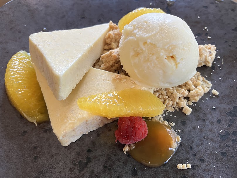 After our soup, we were looking forward to dessert. We’ve noticed before at the Dalmore Inn that they’re pretty good at puddings, so our hopes were high. We had both ordered their daily special: autumnal spiced parfait with orange segments, spiced biscuit crumb and orange sorbet. It certainly looked very appealing when it arrived.