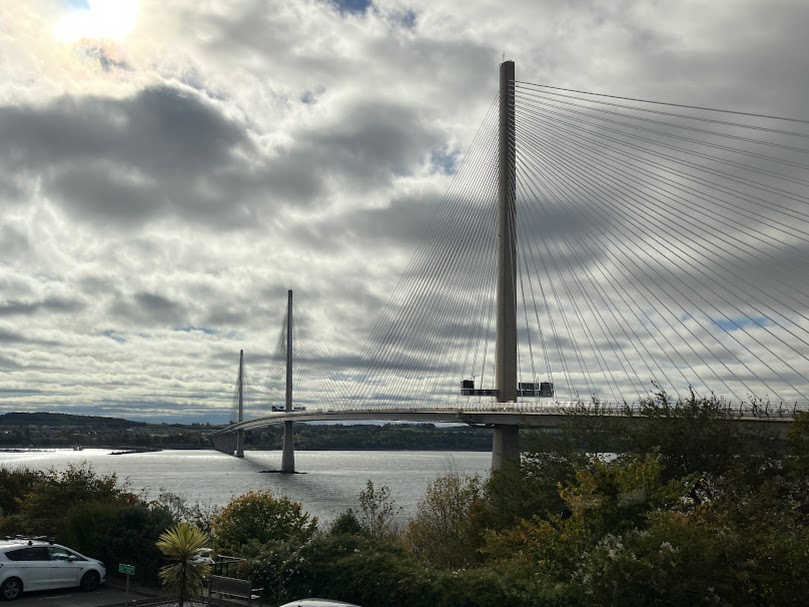 We were seated by a window, with a fine view of the newest of the three bridges that span the Firth of Forth at this point. As we sat looking out at the Queensferry Crossing, we remembered the occasion, in 2017, when we walked across this bridge after it had just been opened. It was designed exclusively for vehicles, and pedestrians are not normally permitted to cross it. However, an opportunity was granted, through a public ballot, to celebrate the opening. The fortunate 50,000 of us who obtained tickets traipsed across it over a weekend in September. The walk was 1.7 miles (2.7km) long.