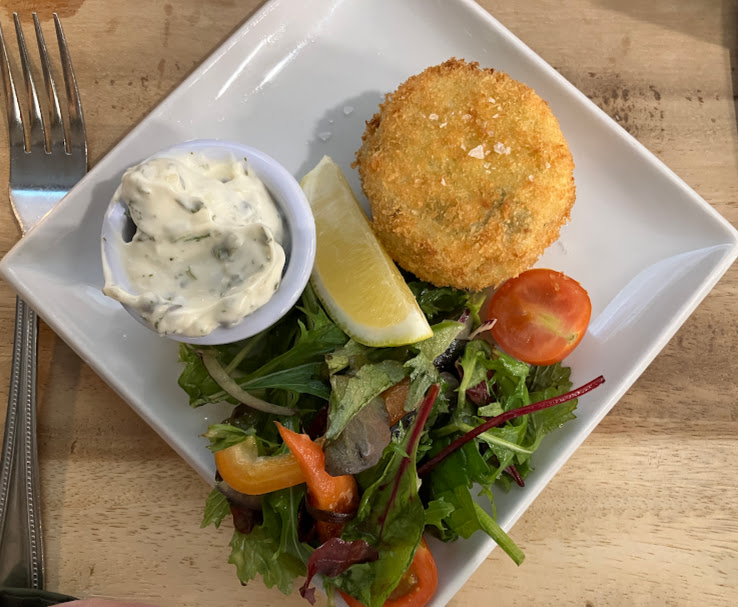 I chose a dish I often have when I come here: a starter portion of fishcake with tartare sauce and salad. I sometimes add a bowl of chips, but Flora’s meal was coming with chips and she said I could have some of hers.
