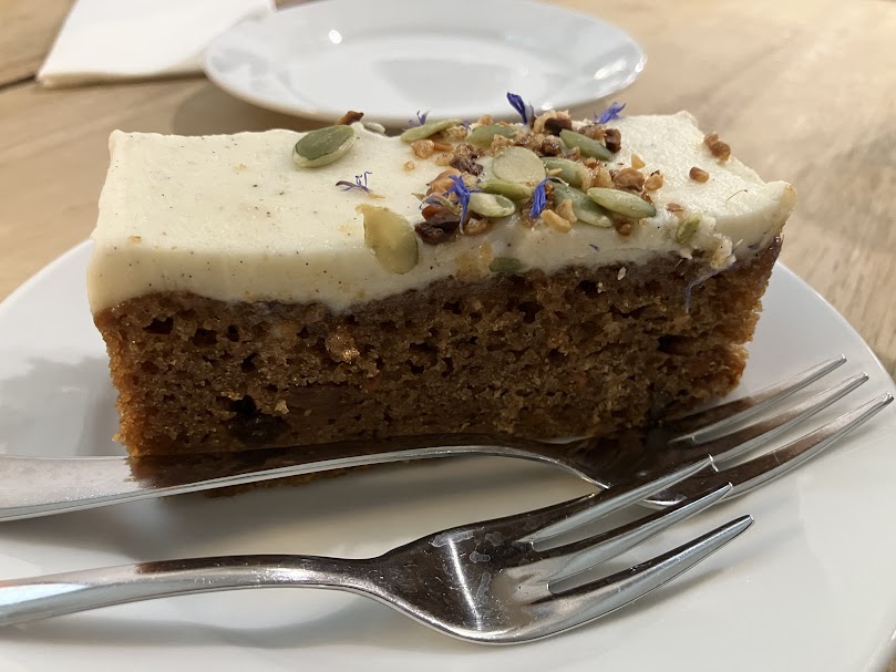 All three of us very much enjoyed our meals, and didn’t have much room for anything else, but Lorna and I shared a slice of carrot cake to round things off.
