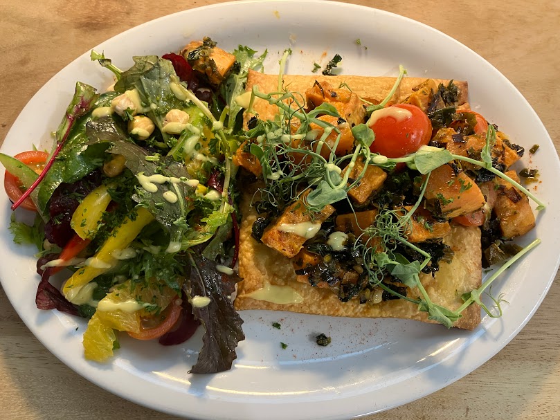 Lorna opted for a vegan dish of leek, cavolo nero and sweet potato tart, served with a hazelnut and orange salad.