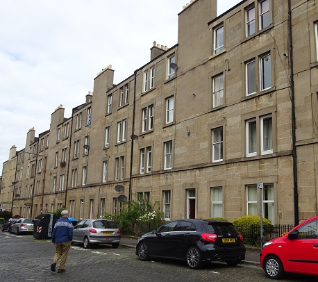 The friendship flourished and on 2 June 1926, when he was 33, Robert McInnes married Madge Watt. I think that his parents’ flats in Cathcart Place and Dalry Road had been rented properties. Robert was not highly paid, but he had been saving up to buy a home for himself, and before the wedding he had bought a flat in 15 Cathcart Place, across the street from his boyhood home. That tenement is on the right of the Cathcart Place photograph above (beyond the red car) and the photograph below shows me walking towards the street level entrance door.