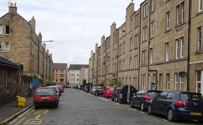 On a recent visit to Edinburgh I was able to go to Cathcart Place, the street where both my father and I were born (in different houses). The road is paved with ‘causies’ (causeway stones) and it looks much the same as it did when I was a child, except that now there are painted lines – white lines showing where cars may be parked, and yellow ones where parking is forbidden or at least discouraged. There were very few cars in this part of Edinburgh in the 1930s. I and the other local children were able to play in the street, unaffected by traffic.